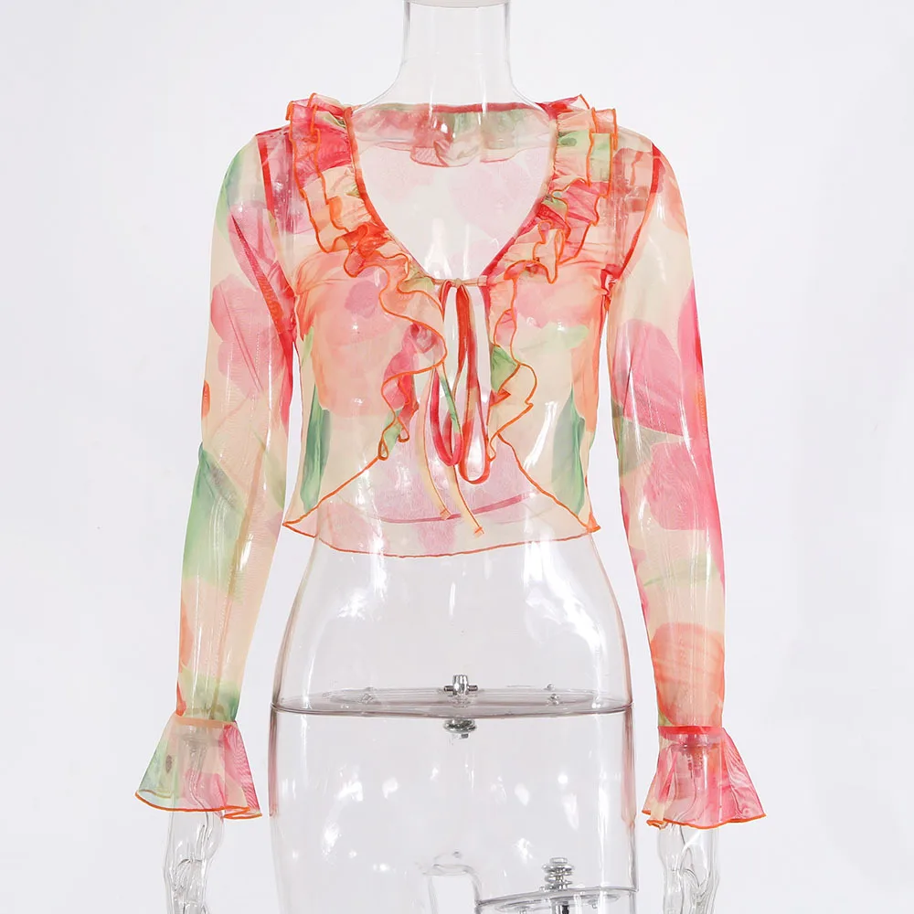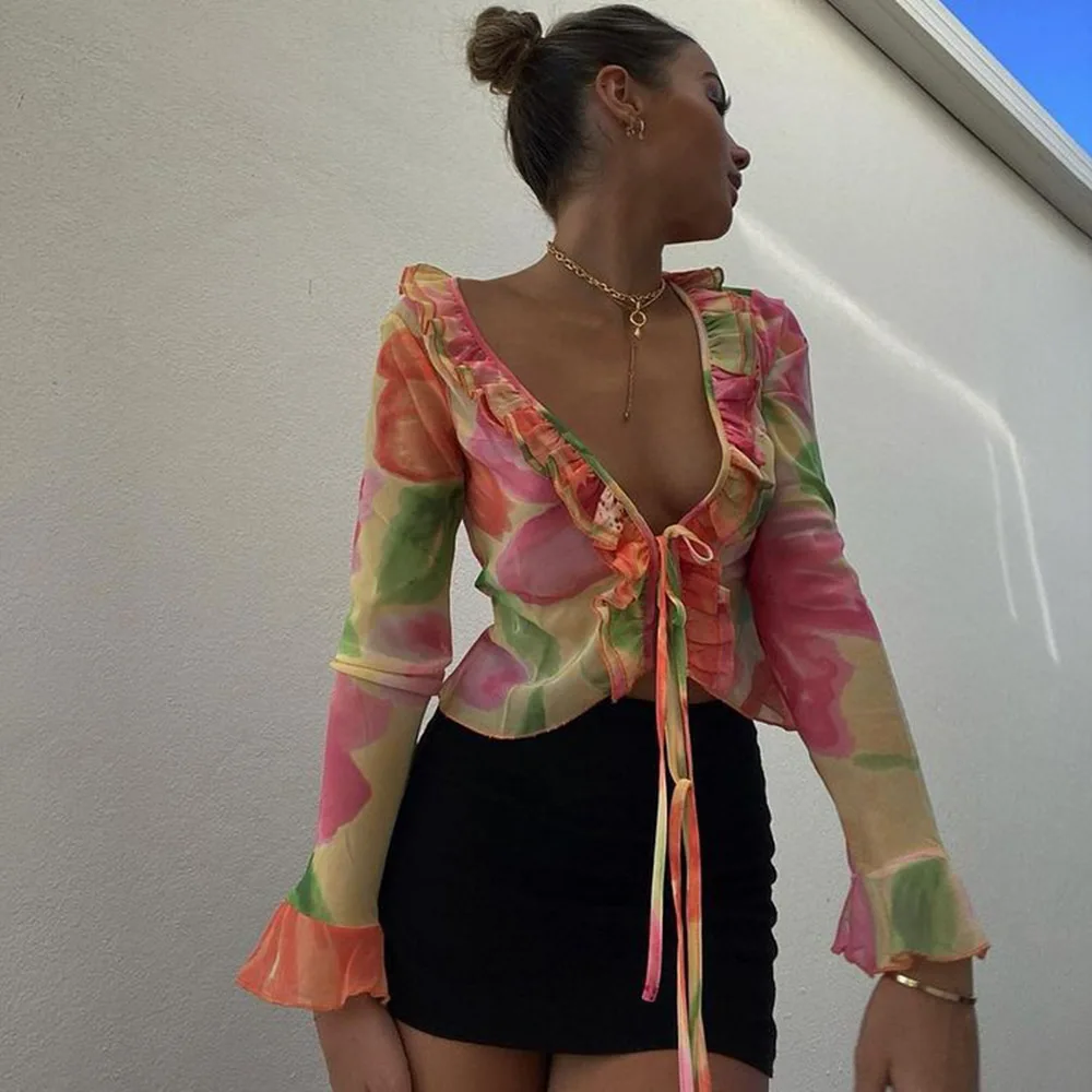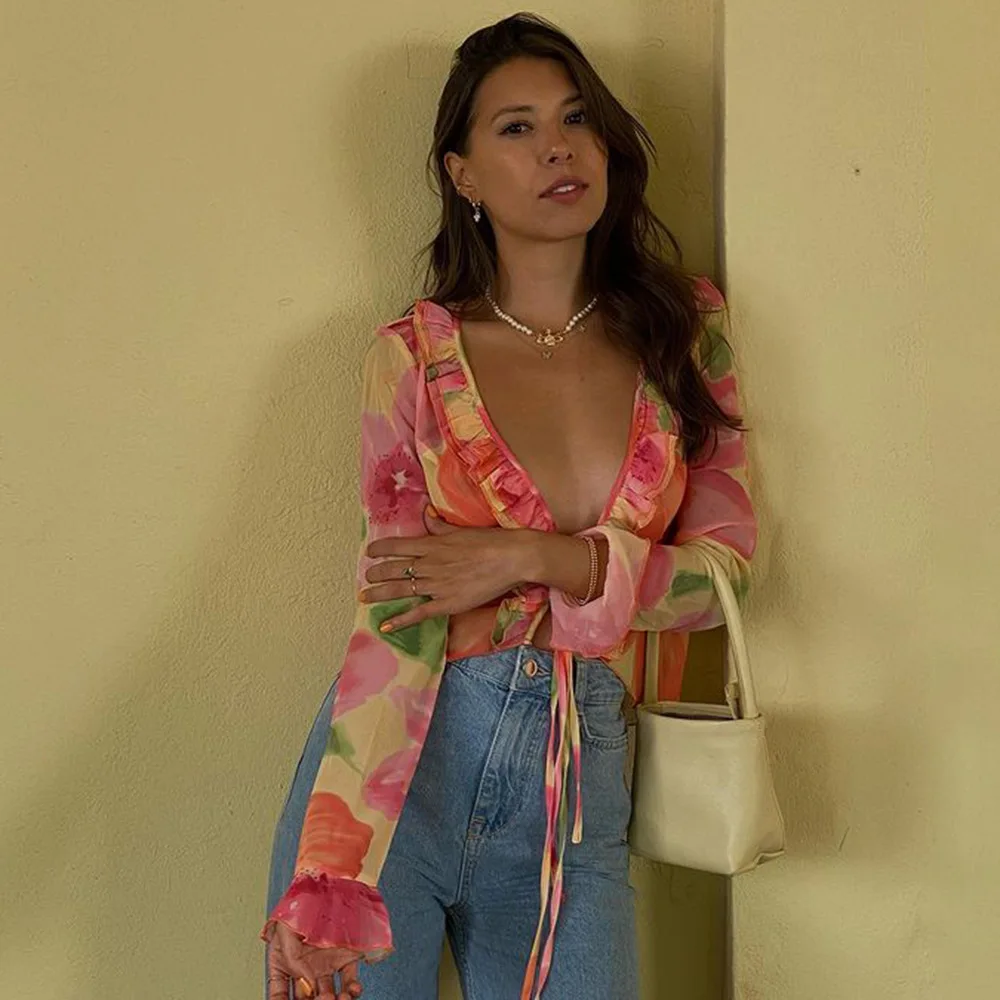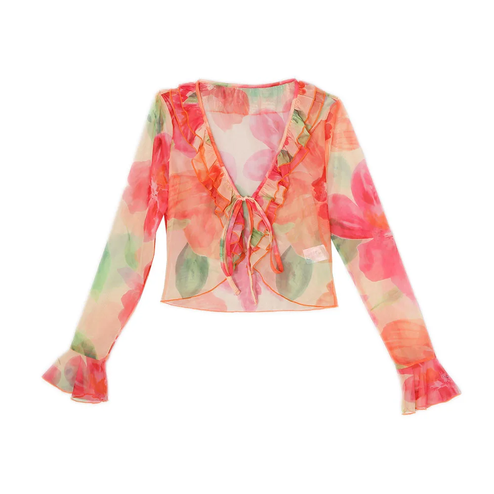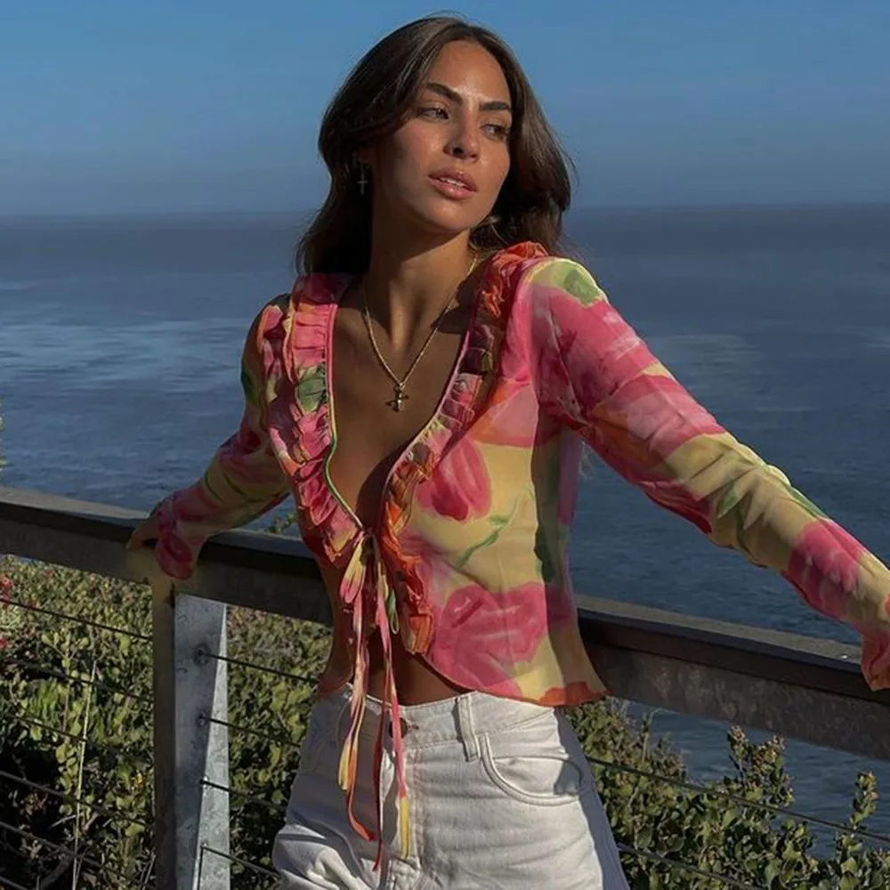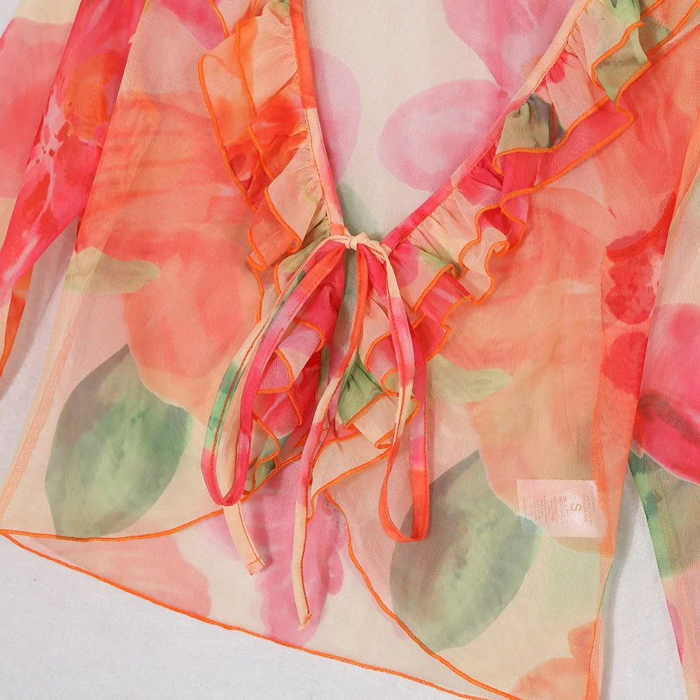 Un ensemble qui combine sexy, sophistication et originalité. Le mélange du transparent, du V profond et du cardigan imprimé crée un look immédiatement stylé — parfait pour se démarquer en été.