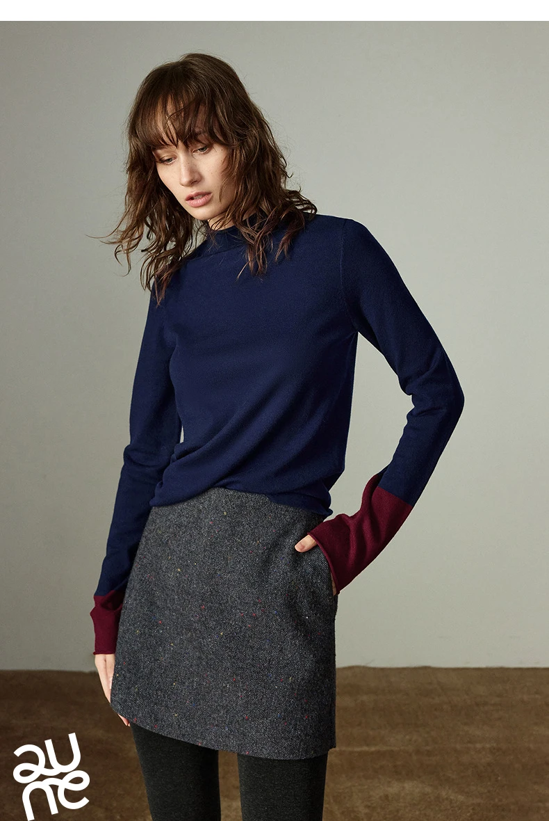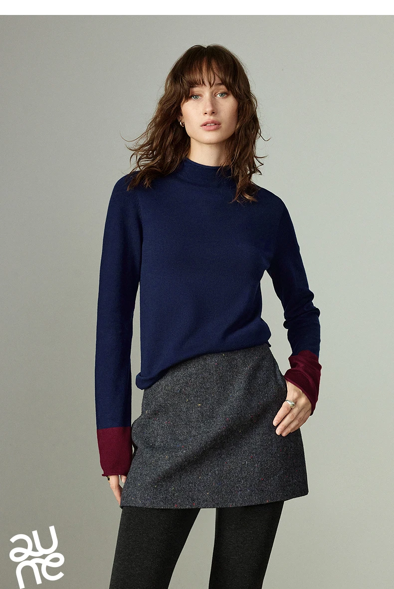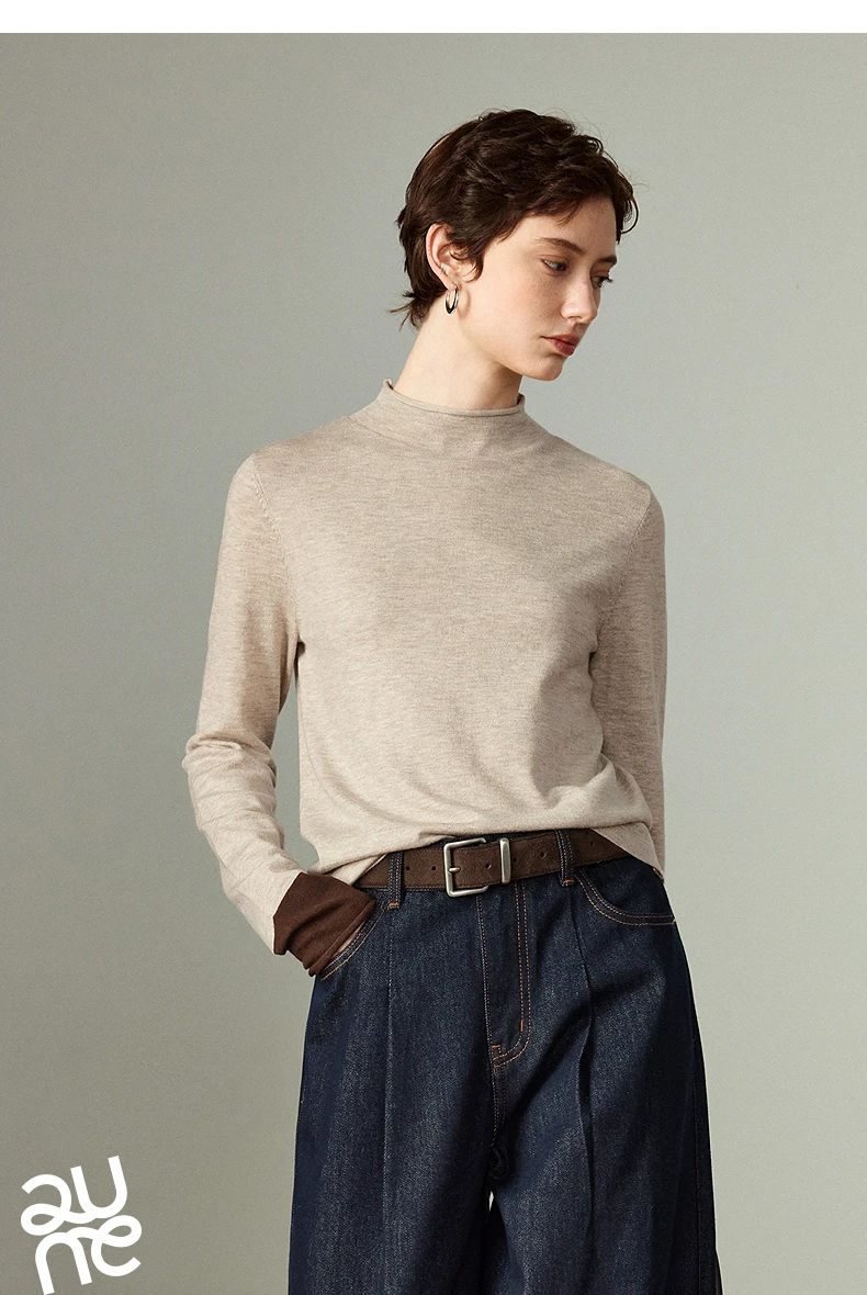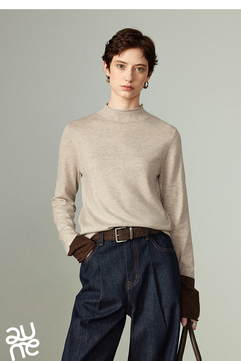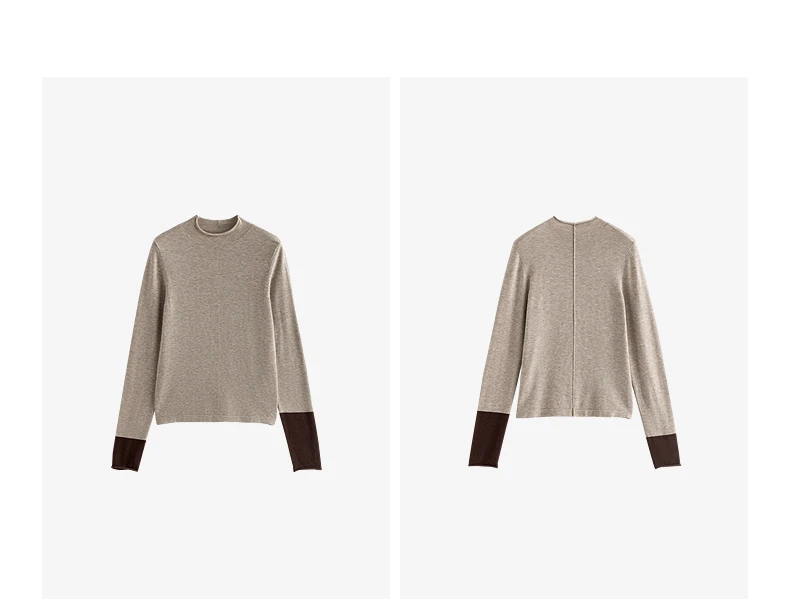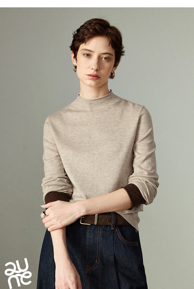 Pull slim pour femme avec col demi-haut, conçu comme couche de base confortable. Son design color-block en teintes ambre apporte chaleur et style, idéal pour un look élégant et cosy au quotidien ou en superposition.